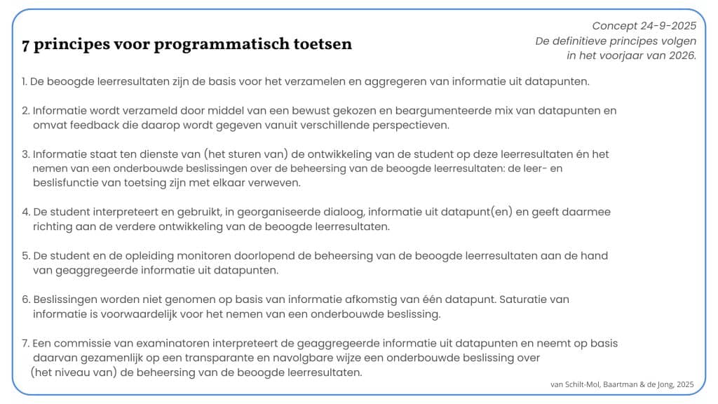 Programmatisch toetsen is een concept, geen recept. Het kan en wordt op verschillende manieren vormgeven. Wel zijn er een aantal principes die dienen als ontwerpkader. Recent presenteerde Tamara van Schilt-Mol en Liesbeth Baartman tijdens ons congres Van Foto Naar Film (2025) een herijking hiervan. Zij komen tot deze 7 principes voor programmatisch toetsen – die zij de komende maanden mogelijk verder willen verscherpen: